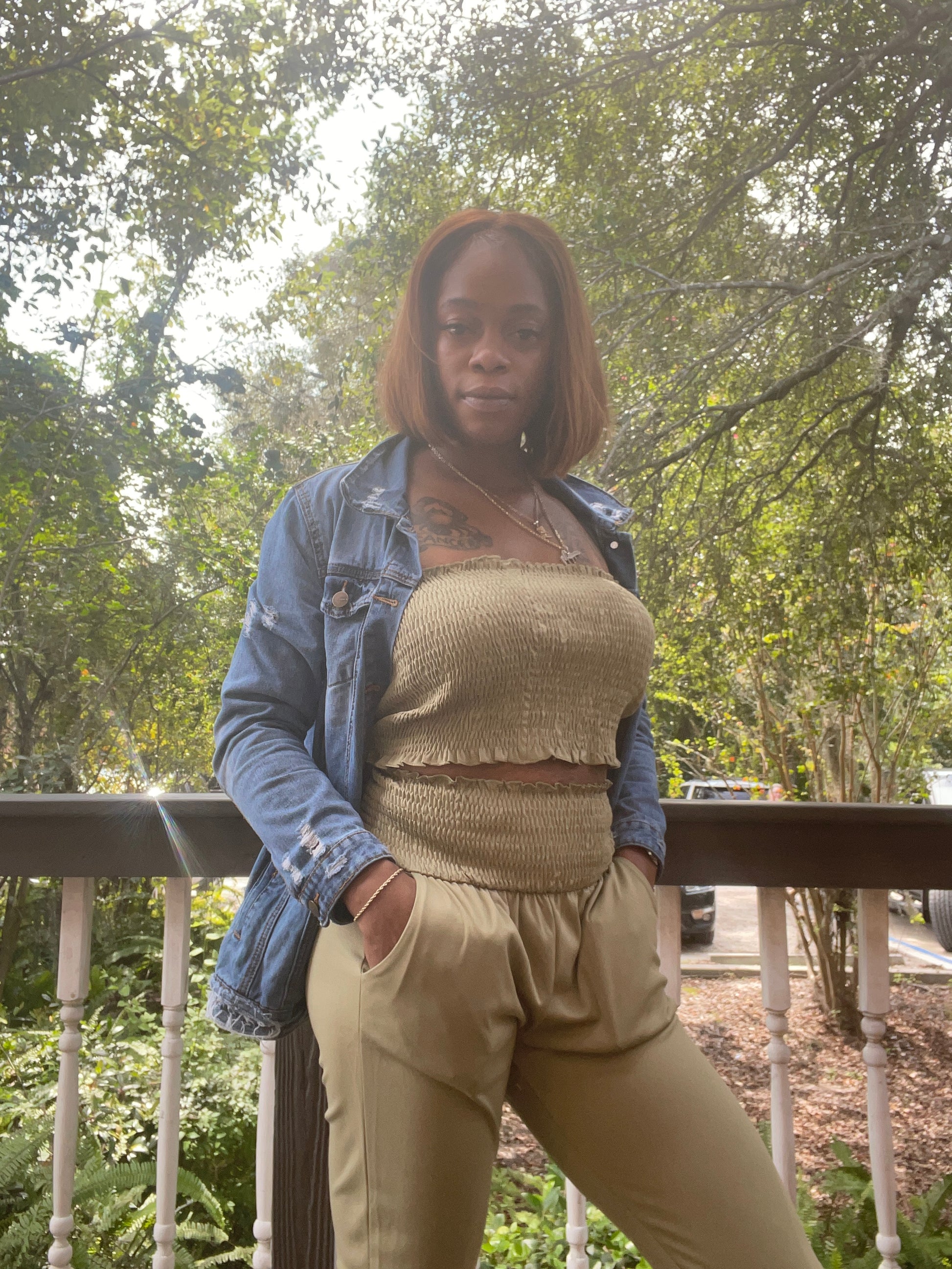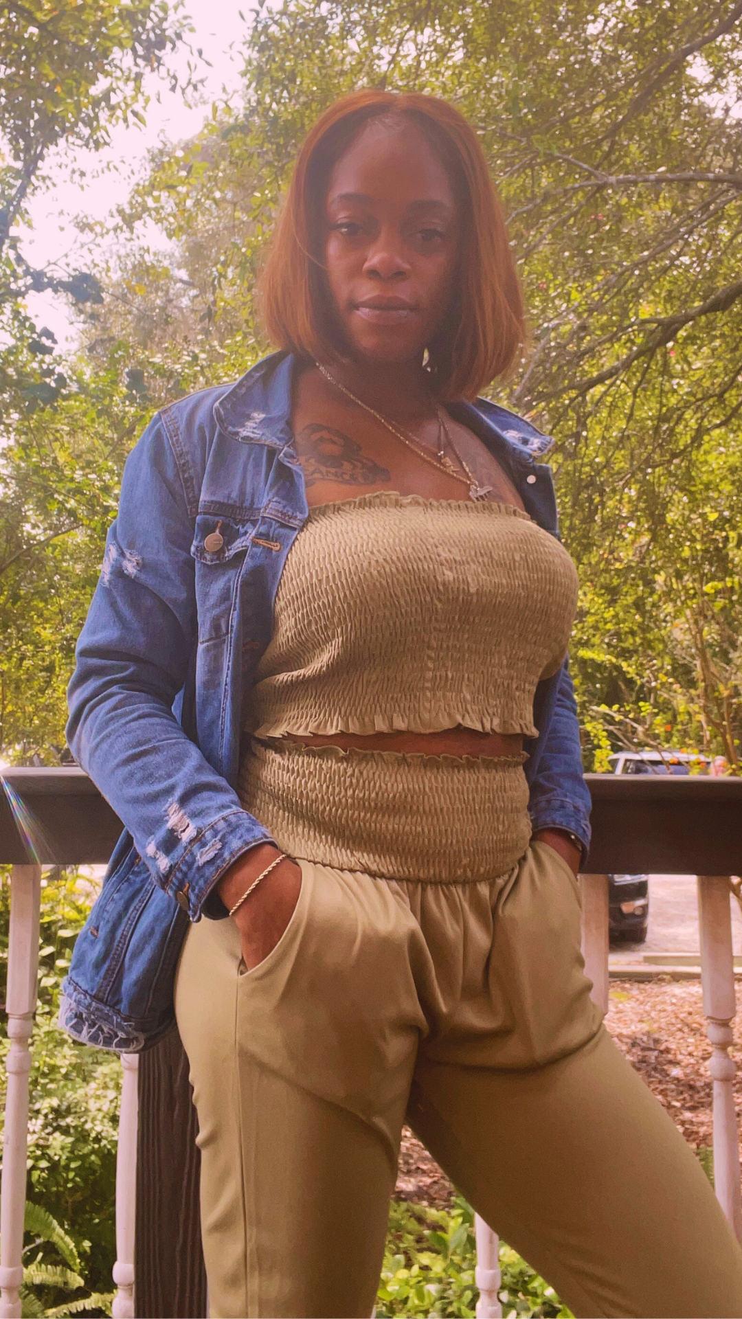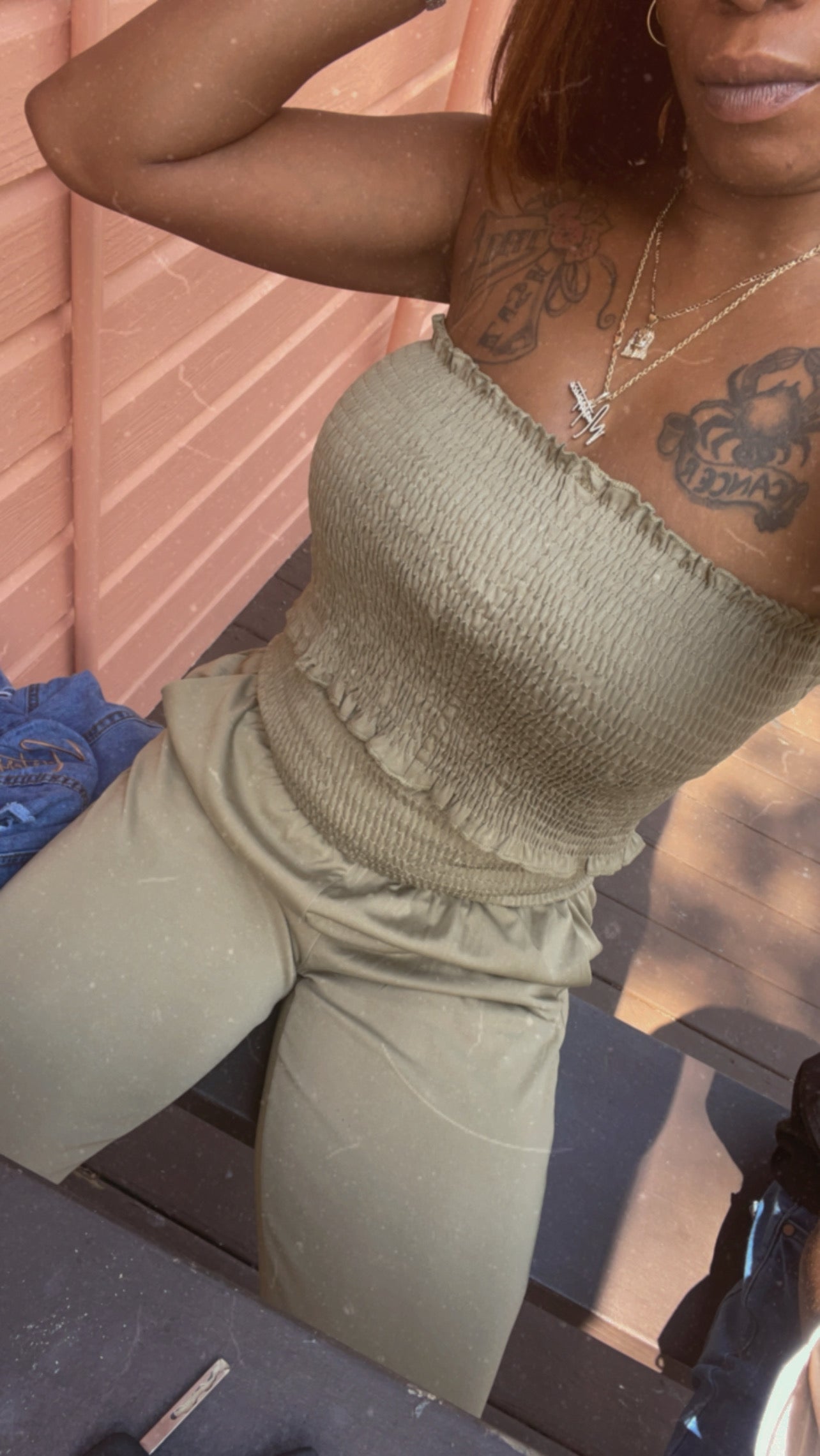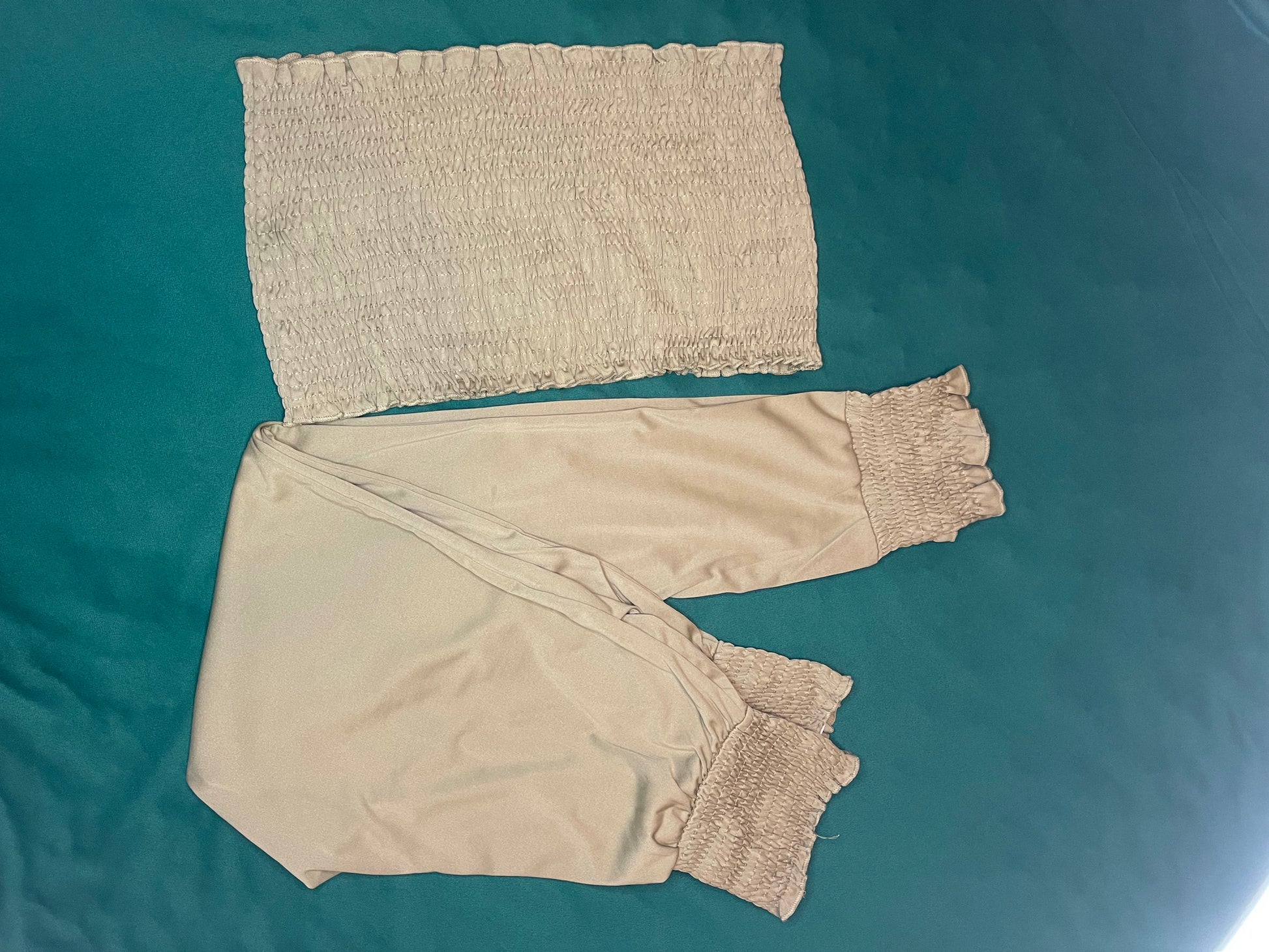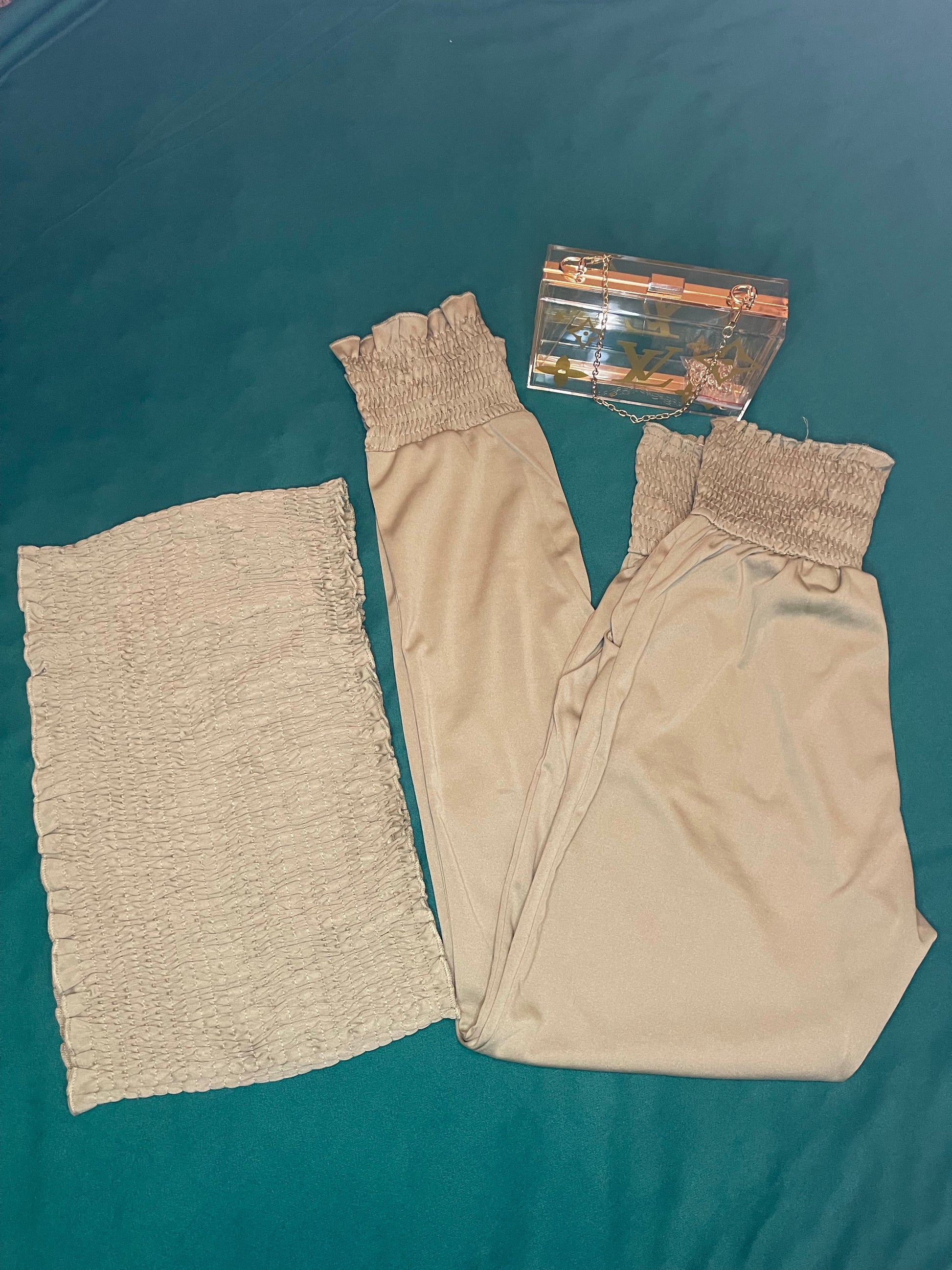 Crafty scrunch tube top, high waisted pants with pockets. Plenty of stretch.